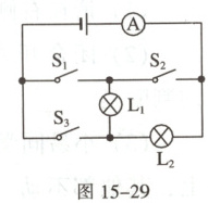 2. 如图15-29所示,电源电压不变。当只闭合开关$S_1$时,灯$L_1$和$L_2$都发光,电流表$A$的示数为$0.16\ A$;当只闭合开关$S_2$和$S_3$时,灯$L_1$和$L_2$都发光,电流表$A$的示数为$0.58\ A$。试完成下列问题: