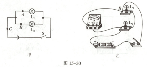 1. 在探究“并联电路中干路电流与各支路电流的关系”实验中,小明同学设计了如图15-30甲所示的实验电路。