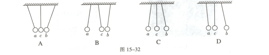 1. 假如自然界存在第三种电荷,且遵循已有的电荷间的作用规律。如图15-32所示,$a$、$b$、$c$三个轻质小球分别带正电荷、负电荷和第三种电荷,均用绝缘细线竖直悬挂,相互靠近但始终不接触,三个小球的最终状态可能为(