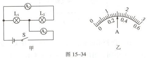 3. (多选)如图15-34甲所示的电路中,闭合开关,两灯泡均发光,且两个完全相同的电流表指针偏转均如图乙所示,下列判断正确的是(