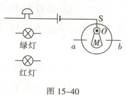 2. 生活应用 某船上装有平衡警示电路,其中$S$为重力开关,金属片$M$可绕$O$点自由转动。当船水平时,$M$在$a$、$b$中间;当船左倾到一定程度时,绿灯亮、电铃响;当船右倾到一定程度时,红灯亮、电铃响。请完成电路图15-40。