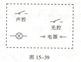 1. 为了节约能源,方便师生夜晚出行,学校楼道安装声、光控灯,要求:夜间且有人通过时灯才发光。根据图15-39中的元件,画出声、光控灯的电路图。