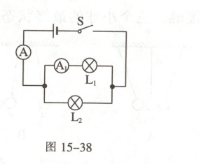 3. 如图15-38所示,已知电流表$A_1$的读数为$0.2\ A$,电流表$A$的读数为$0.5\ A$,则通过灯$L_2$的电流为