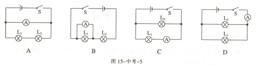 5.(大连)如图 15-中考-5 电路图中,电流表能直接测量灯 L₁电流的是(