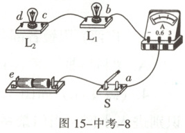 8.AC[解析]A.用导线连接c、e(如图15'-中考-1a),此时只有灯泡L₁接入电路中,所以电流表只能测量通过灯泡L₁的电流,故A正确;B.用导线连接d、e(如图15'-中考-1b),两个灯泡串联接入电路中,因串联电路中各处的电流相等,则此时电流表既能测通过灯泡L₁的电流,也能测通过灯泡L₂的电流,故B错误;C.用两根导线分别连接a、d和c、e时(如图15'-中考-1c),此时两个灯泡并联,电流表串联在L₁的支路中,测量的是L₁的电流,故C正确;D.用两根导线分别连接b、d和c、e(如图15'-中考-1d),此时两个灯泡并联,电流表接在干路中,测量的是干路的电流,故D错误。