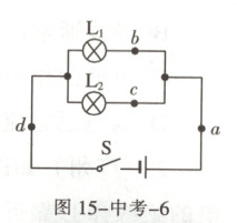 6.(海南)如图 15-中考-6 所示电路,探究并联电路中电流的关系。L₁与 L₂是两个不同规格的小灯泡,闭合开关后,通过 a、b、c、d 四处电流的大小关系正确的是(