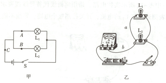 (1)图甲是他们设计的电路图,实验时需要测量 A、B、C 三处的电流。图乙是他们某次测量时连接的实验电路,此时电流表测量的是