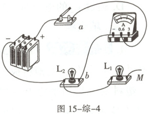 4. 如图 15-综-4 所示,在“用电流表测电流”的实验中,电路的其他部分都已连接完毕,只有导线 M 还未连入电路。下列说法正确的是(