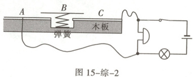 2. 生活应用 如图 15-综-2 所示是一个具有报警功能的展台,该展台由木板、弹簧、金属片 A、B、C 和报警电路组成。金属片 A、C 相当于导线,弹簧上的金属片 B 相当于开关,物品放在金属片 B 上面,闭合开关 S,当有人把物品搬离展台时,金属片 B 在弹力作用下与金属片 A、C 分开,这时(