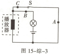 3. 一款定时音乐盒,其装置如图 15-综-3 所示,播放前定时开关 S 是闭合的,当设定播放时间到,定时开关 S 会自动断开,就会有电流通过播放器播放音乐,如果想让播放器停止工作,维修人员应该在图 15-综-3 中 A、B、C 三个位置中的哪个位置断开导线(