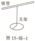 1. 如图 15-综-1 所示,用一段细铁丝做一个支架(作为转动轴),把一根中间戳有小孔(没有戳穿)的塑料吸管放在支架上,吸管能在水平面内自由转动。用餐巾纸摩擦吸管,使其带负电。下列分析正确的是(