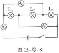 8. (多选)如图 15-综-8 所示的电路中,开关闭合后,已知电流表 A₁、A₂、A₃ 的读数分别为 0.6 A、0.5 A、0.3 A,下列说法正确的是(