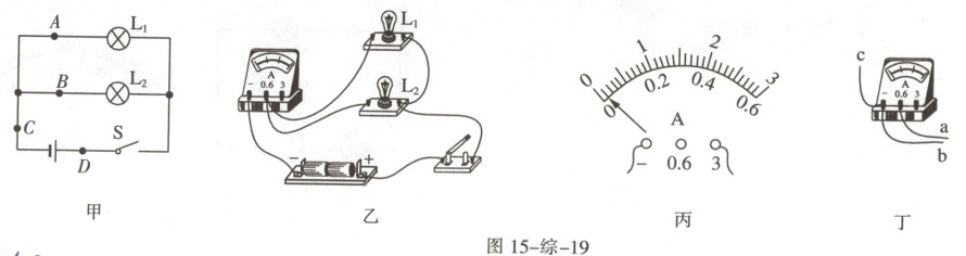 2. 科学探究 在探究并联电路的电流特点时,某班各组同学从甲、乙、丙、丁四种规格的灯中,选取两个并联起来接在相同电源上,组成如图 15-综-19 甲所示的电路,然后把一个电流表分别接入电路中 A、B、C 处测量电流,并记录数据。