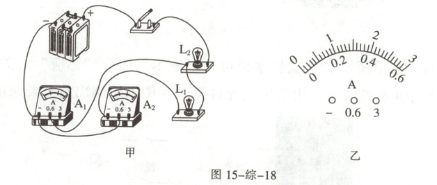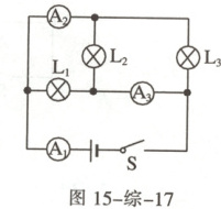 2. 如图 15-综-17 所示,当开关 S 闭合,A₁ 表示数为 0.9 A,A₂ 表示数为 0.7 A。已知流过 L₁ 与 L₂ 灯的电流之比 I₁:I₂ = 1:2,试求流过 L₁、L₂、L₃ 的电流为多大?