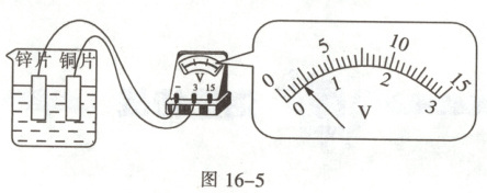 5. (多选) 在烧杯中加入盐水,将铜片和锌片放在盐水中,这就是一个电池。用电压表测量这个电池的电压,其现象如图 16-5 所示,则该电池的(