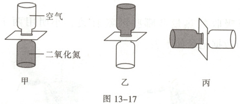 2. 科学思维 将2个分别装有空气和二氧化氮($\rho_{二氧化氮}>\rho_{空气}$)的玻璃瓶口对口对接,中间用玻璃板隔开。抽开隔板后,通过观察瓶内颜色变化推断气体分子是否做无规则运动。对于玻璃瓶的三种放置方法(如图13-17所示),四位同学判断正确的是(