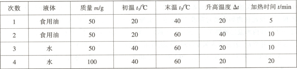 (选填“升高的温度”或“加热时间”)来判断水和食用油吸收热量的多少。(2)比较实验次数1、2我们可以得出:质量相同的同种物质,升高的温度越高,吸收的热量越