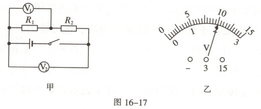 4. (多选) 如图16-17甲所示,当闭合开关后,两只电压表指针偏转均为如图16-17乙所示,则 (