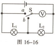 3. (多选) 如图16-16所示的电路图,开关$S$接到$a$时,电压表示数为$9 V$,开关$S$接到$b$时,电压表示数为$4 V$。下列说法正确的是 (