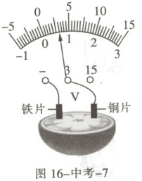 1.(淮安)如图 16-中考-7 所示,取一个橙子,把铜片、铁片插入其中,制成一个水果电池。(1)用电压表测量电压,该水果电池电压为