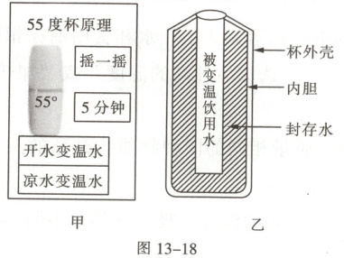 3. 科技创新 如图13-18甲,网上曾热销一种“$55$度杯”,称“能很快将开水变成适饮的温水,而后又能将凉水变成适饮的温水”。为破解此中秘密,某中学物理小组设计了如图乙模型。设此杯内胆中被封存着$300 g$水,室温$20\ ^{\circ}C$;现向杯中倒入$200 g$、$100\ ^{\circ}C$开水,摇一摇,杯内水温迅速降至$t_1$,饮用后迅速将$200 g$室温矿泉水倒入该杯,摇一摇,矿泉水的温度可升至$t_2$,若忽略内胆及空间的热能消耗,则$t_1$、$t_2$分别大约为(