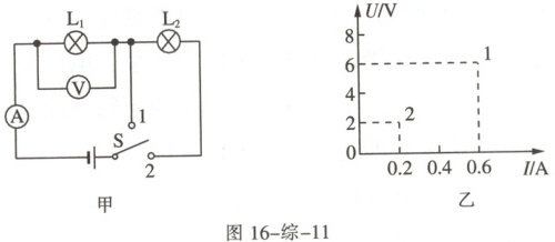 4. 如图 16-综-11 甲所示,当开关 S 由接点 1 转到 2 时,电压表示数变化如图乙所示,则电源电压是