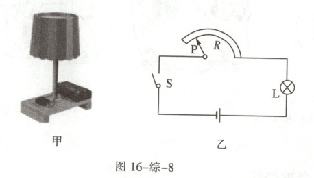 1. 跨学科实践 同学们制作了一个简易调光台灯(如图 16-综-8 甲所示),图乙是其电路原理图。灯泡选择的是发光二极管 LED,LED 具有