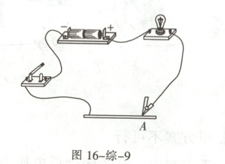 2. 如图 16-综-9 所示,A 为一根铅笔芯,闭合开关后,小灯泡发光,将夹子在铅笔芯上移动时,小灯泡的亮度会发生变化。如果断开开关,铅笔芯的电阻阻值