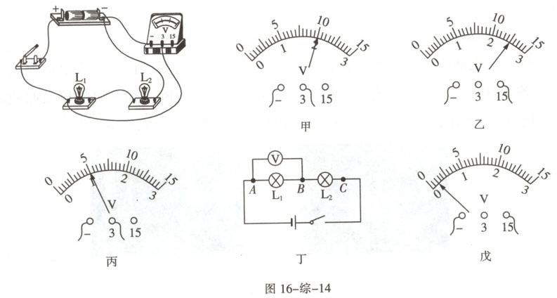 (1)为了使探究得出的结论具有普遍意义,L₁、L₂应该选择不相同的小灯泡;如图(见图16'-综-2)的连接方式中,电压表与电源并联,故电压表测量的电压是电源电压;题图甲、丙中,电压表选用小量程,分度值为0.1V,示数分别为2V和1V,丙中电压表选用大量程,分度值为0.5V,电压表示数为12.5V,因电源电压为2节干电池,故电源电压为3V,根据串联电路电压的规律,这时题甲图可能是此时电压表的读数。