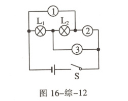 5. 在如图 16-综-12 所示的电路中,①、②、③是三个电表(电压表或电流表)。闭合开关 S,要使灯 $L_1$ 与 $L_2$ 串联,则电路中
