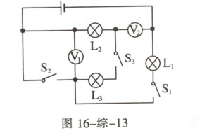 6. 如图 16-综-13 所示电路中,电源电压不变,当开关 $S_1$、$S_2$、$S_3$ 都断开时,$V_2$ 的示数为 9 V;当开关 $S_1$、$S_3$ 闭合,$S_2$ 断开时,$V_1$ 的示数为 6 V,$V_2$ 的示数为 5 V,则电源的电压为