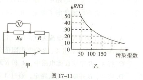 5. 科技创新 如图 17-11 甲所示是九年级的同学们在参加“中学生物理科技创新大赛”时,设计的空气质量监测仪的原理图。电源电压恒为$3\ V$,$R_0$为$10\ \Omega$的定值电阻,$R$为可以感知空气污染指数的可变电阻,其阻值随污染指数变化的情况如图乙所示。电压表的示数越大,表示污染指数