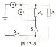 2. 如图 17-9 所示电路,电阻$R_1 = 30\ \Omega$,只闭合开关$S_1$,电流表 A 的示数为$0.2\ A$,由此可知电源电压为
