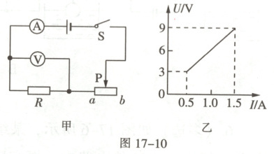 4. 如图 17-10 甲所示,电源电压不变,闭合开关,滑片 P 由 b 端滑到 a 端,电压表示数$U$与电流表示数的变化关系如图乙所示,则电源电压为