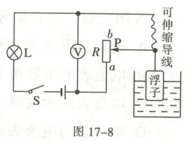 1. 跨学科实践 如图 17-8 所示是小明设计的水位计工作原理图,绝缘浮子随水位的升降带动滑动变阻器$R$的金属滑杆 P 升降,通过电压表的示数及指示灯 L 的亮度变化反应水位升降,当水位上升时,浮子上升,滑动变阻器的滑片向
