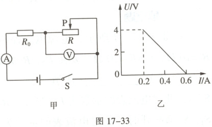 2. 在图17-33甲电路中,电源电压不变,$R_0$为定值电阻,$R$为滑动变阻器。在滑片$P$从最右端向最左端滑动过程中,电压表与电流表的示数变化关系如图乙所示。则下列说法正确的是 (