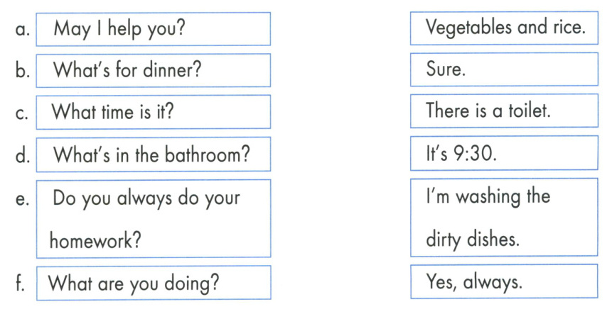 a-Sure. b-Vegetables and rice. c-It’s 9:30. d-There is a toilet. e-Yes, always. f-I’m washing the dirty dishes.
