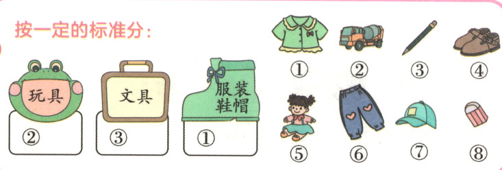 玩具:$\boldsymbol{⑤}$;文具:$\boldsymbol{⑧}$;服装鞋帽:$\boldsymbol{⑥⑦}$ 。