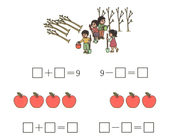 图中左边有$5$棵树苗,右边有$4$棵树苗,一共有$9$棵树苗。