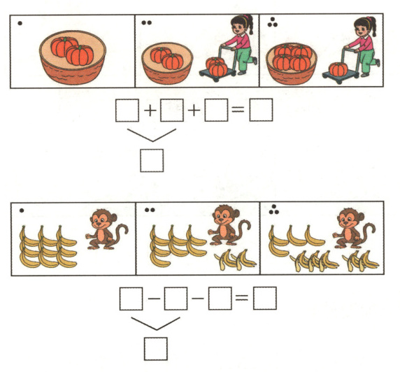 观察第一组图,第一个筐里有$3$个南瓜,第二次推来$1$个南瓜,第三次推来$2$个南瓜。
