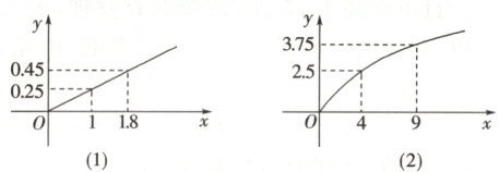 [典例讲评] 2. (源自湘教版教材)某企业生产A,B两种产品,根据市场调查和预测,A产品的利润$y$(万元)与投资额$x$(万元)成正比,其关系如图(1)所示;B产品的利润$y$(万元)与投资额$x$(万元)的算术平方根成正比,其关系如图(2)所示.