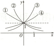 1. 如图是指数函数①$y = a^{x}$,②$y = b^{x}$,③$y = c^{x}$,④$y = d^{x}$的图象,则$a,b,c,d$与$1$的大小关系是 (