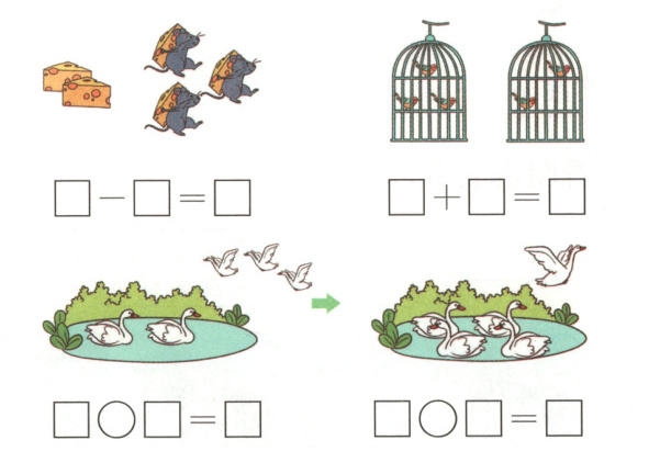 原本有$5$块奶酪,老鼠搬走$3$块,列式为$5 - 3=2$。