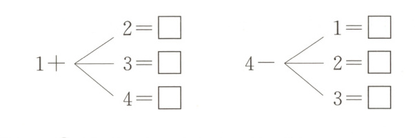 )里填上合适的数。$( \quad ) + 2 = 5$ $2 + ( \quad ) = 4$ $( \quad ) - 4 = 1$
