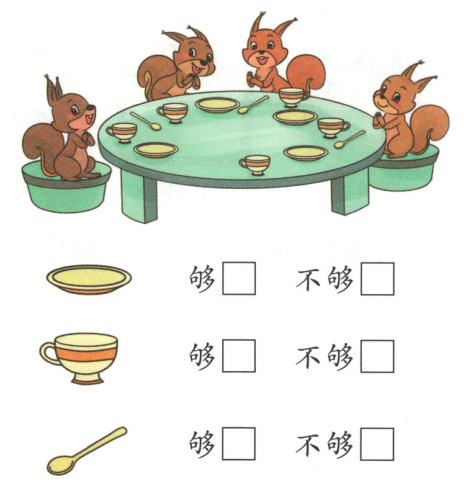 3 数一数,比一比,盘子够吗?杯子呢?勺子呢?在$□$里画“√”。