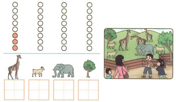 2 周末,安安到动物园游玩。请你照样子数一数,涂一涂,写一写。