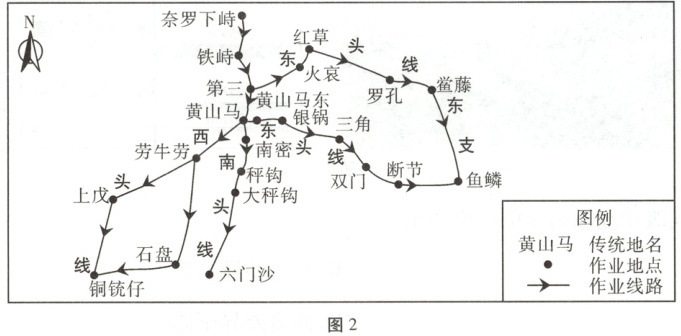 《海录》记载了我国清代船员的航海见闻:“万山一名鲁万山,广州外海岛屿也。山有二,东山在新安县界,西山在香山县界,沿海渔船籍以避风雨。西南风急则居东澳,东北风急则居西澳,凡南洋海艘俱由此出口,故纪海国自万山始。”下图展现了海南先民根据航向和用航海时间估算的距离而绘制的南海作业线路(局部) 。据此完成 3—4 题。
