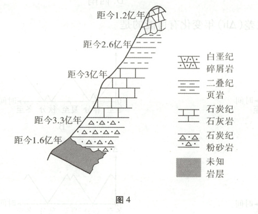 解题思路读图可知,白垩纪碎屑岩形成于1.2亿年前,二叠纪页岩形成于2.6亿年前,未知岩层形成于1.6亿年前,据此可以判断未知岩层的形成时期介于白垩纪与二叠纪之间。根据材料可知,图中出露岩层经历了晚古生代的泥盆纪、石炭纪、二叠纪和中生代的三叠纪、侏罗纪、白垩纪等地质时期的变迁,可知未知岩层的形成时期可能为三叠纪或侏罗纪。图中未知岩层位于形成年代较早的岩层下方,可判断未知岩层是岩浆侵入、冷却凝固后形成,花岗岩为侵入型岩浆岩,D项正确。