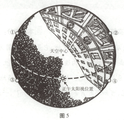 [2024·福建卷,11—13T,9分]街道走向、行道树和建筑物影响街道地面的日照时间长短。福建省学者小明来到美国波士顿(约$42° N$)访学。夏至日,小明在某绿树成荫的街道朝天空垂直拍摄,并将照片绘制成图(图5)。图中虚线示意春分日目视太阳轨迹。该地夏至日昼长约15小时。据此完成13—15题。
