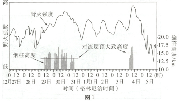 [2025·安徽卷,14—16T,9分]2020年1月1日前后,澳大利亚东南部发生大面积高强度森林野火,引发强烈上升气流,在一定的天气形势下,烟尘上升至对流层顶附近,形成积雨云状烟柱。图1表示该区域野火强度与积雨云状烟柱高度随时间变化情况。据此完成1—3题。